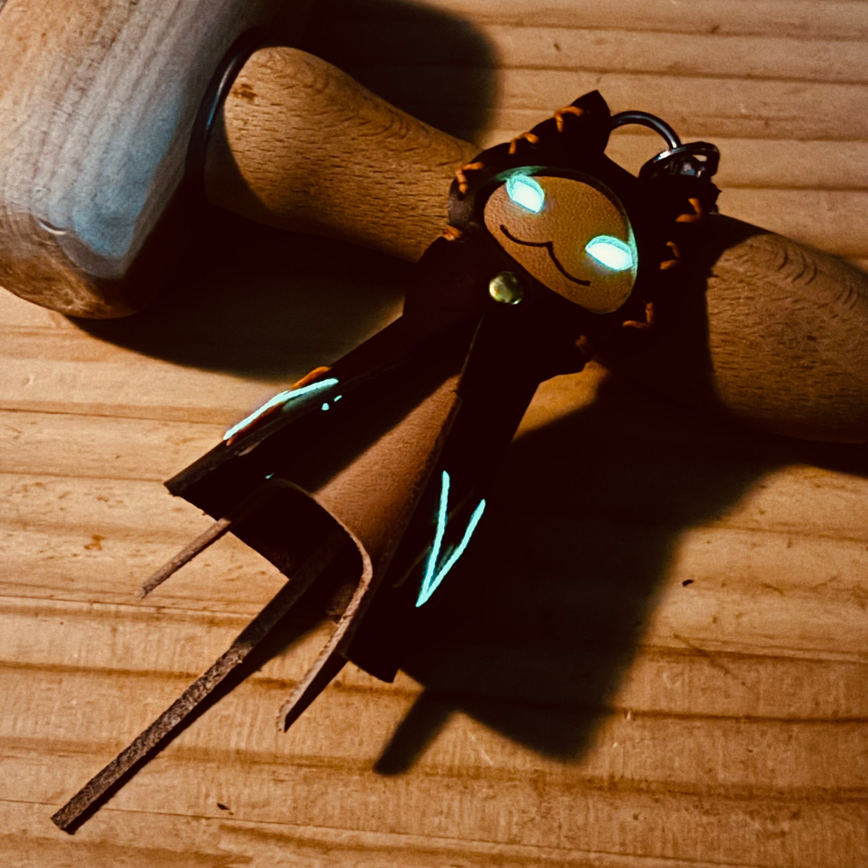 目の部分とケープの飾り縫い部分に蓄光素材を使っているので、暗い場所に持ち込んだりブラックライトを当てる事でぼんやり光ります。