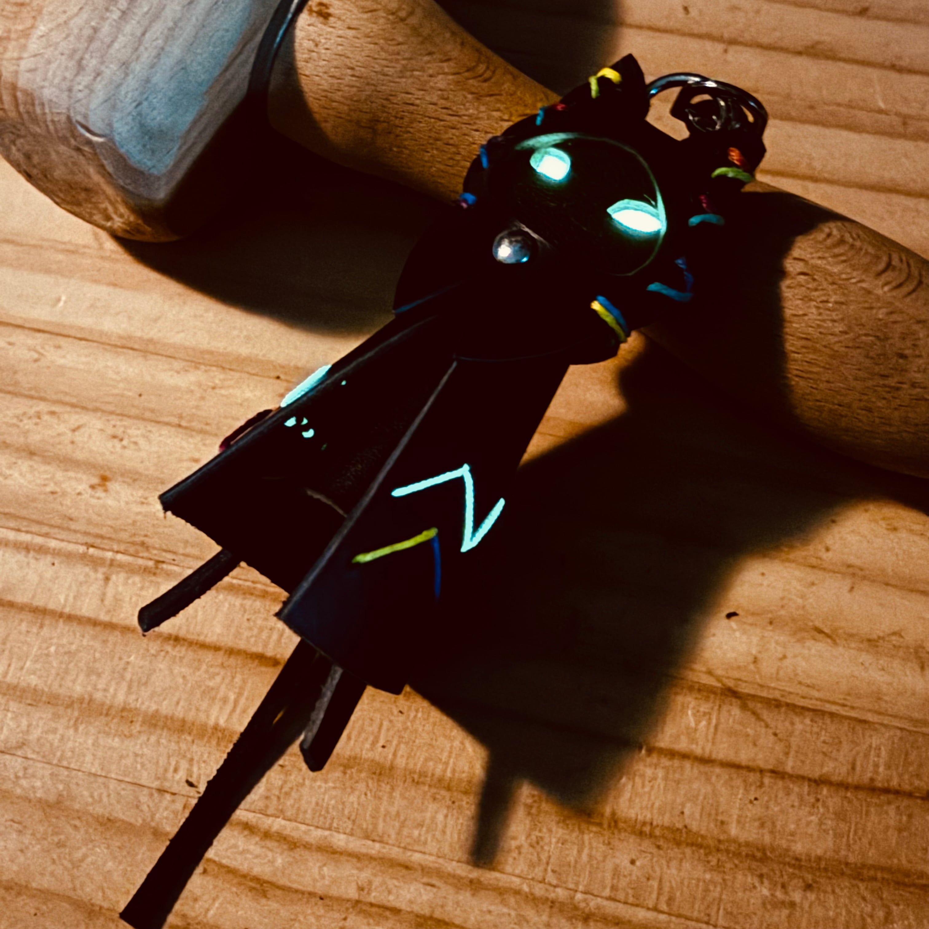 目の部分とケープの飾り縫い部分に蓄光素材を使っているので、暗い場所に持ち込んだりブラックライトを当てる事でぼんやり光ります。