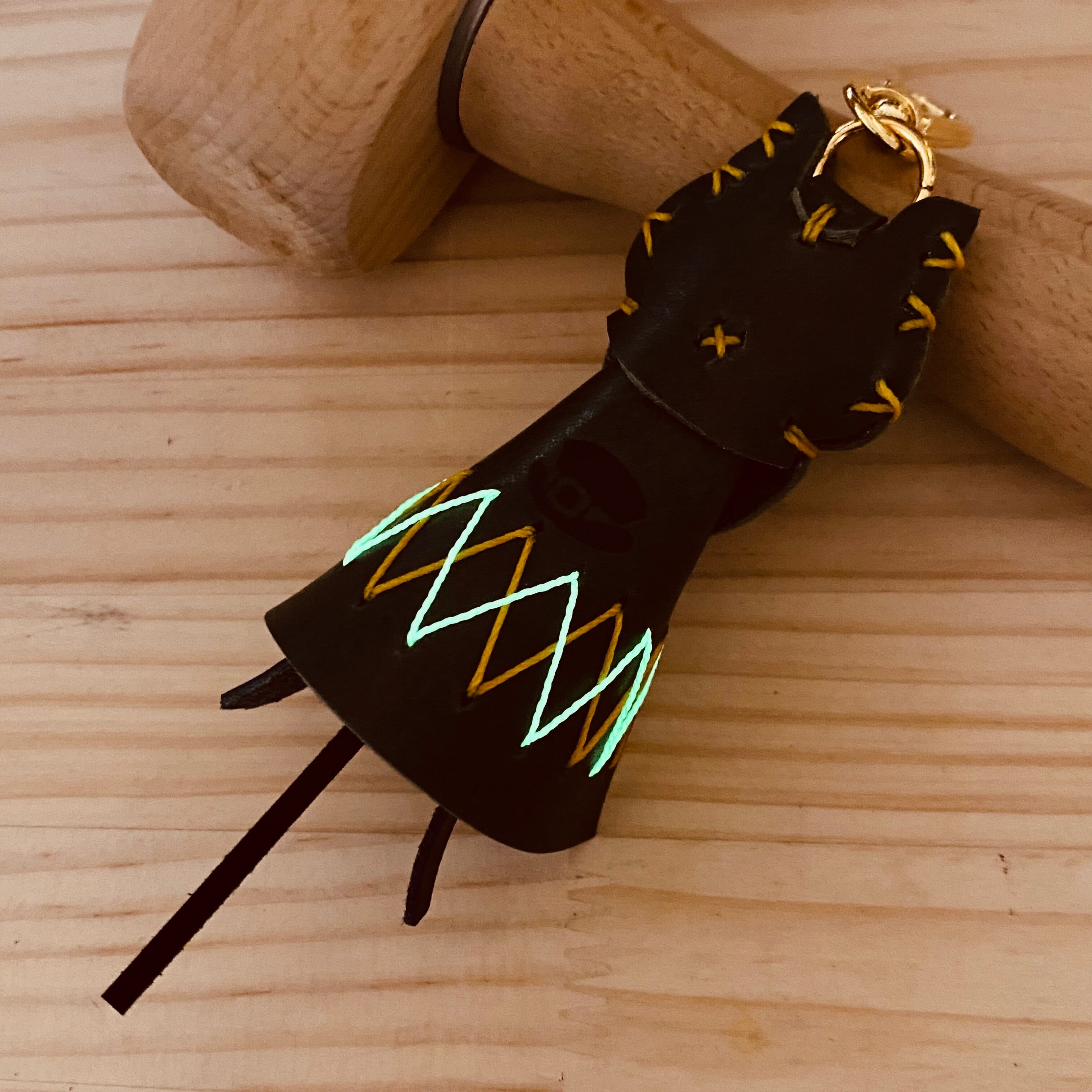 目の部分とケープの飾り縫い部分に蓄光素材を使っているので、暗い場所に持ち込んだりブラックライトを当てる事でぼんやり光ります。