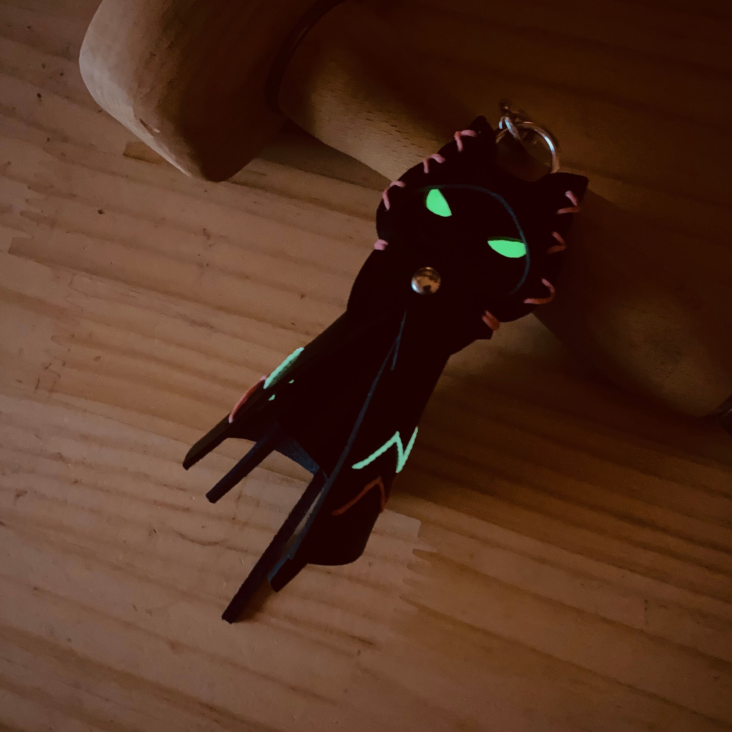 目の部分とケープの飾り縫い部分に蓄光素材を使っているので、暗い場所に持ち込んだりブラックライトを当てる事でぼんやり光ります。