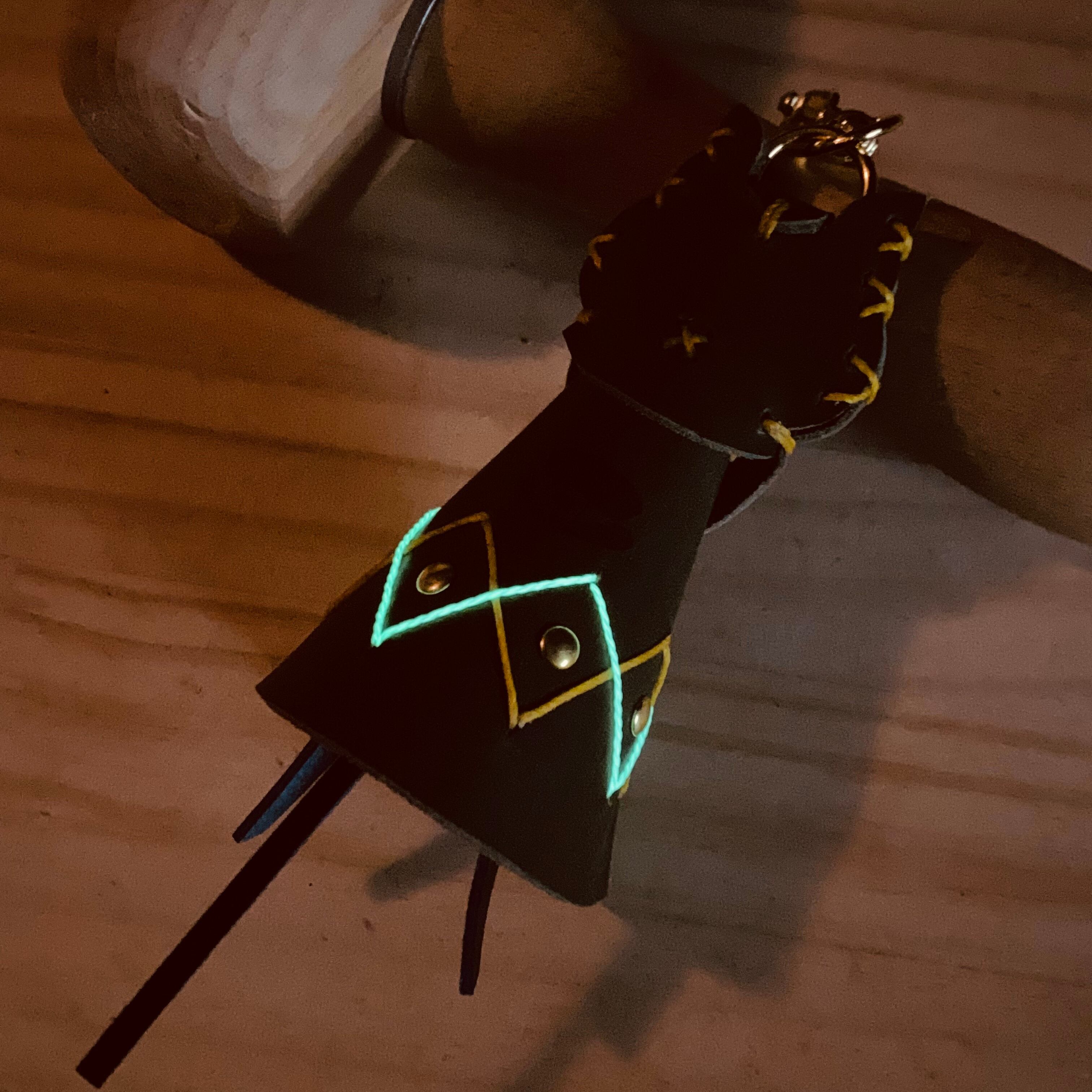 目の部分とケープの飾り縫い部分に蓄光素材を使っているので、暗い場所に持ち込んだりブラックライトを当てる事でぼんやり光ります。