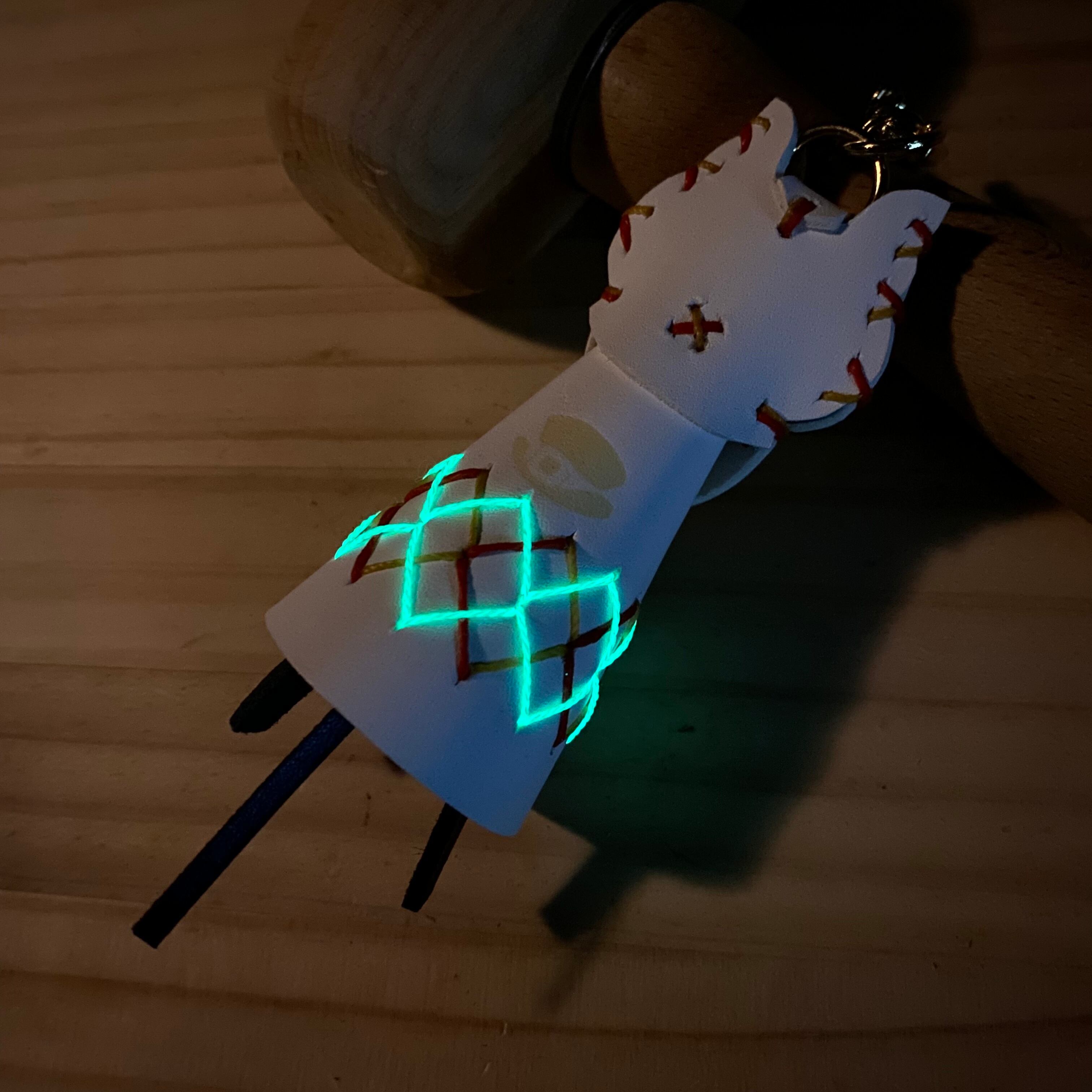 目の部分とケープの飾り縫い部分に蓄光素材を使っているので、暗い場所に持ち込んだりブラックライトを当てる事でぼんやり光ります。