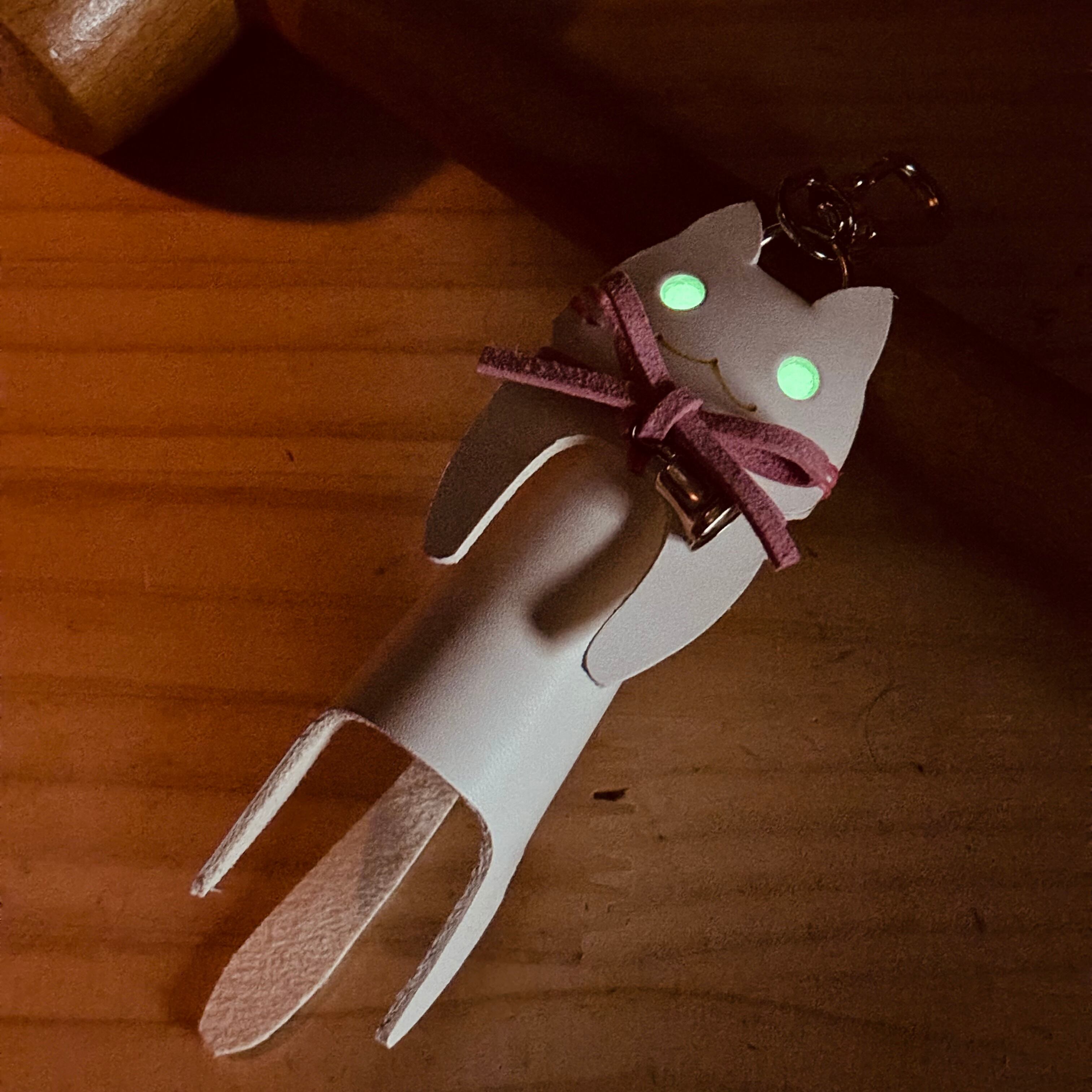 目の部分に蓄光素材を使っているため暗いところに持ち込んだりブラックライトを当てる事でぼんやり光ります。